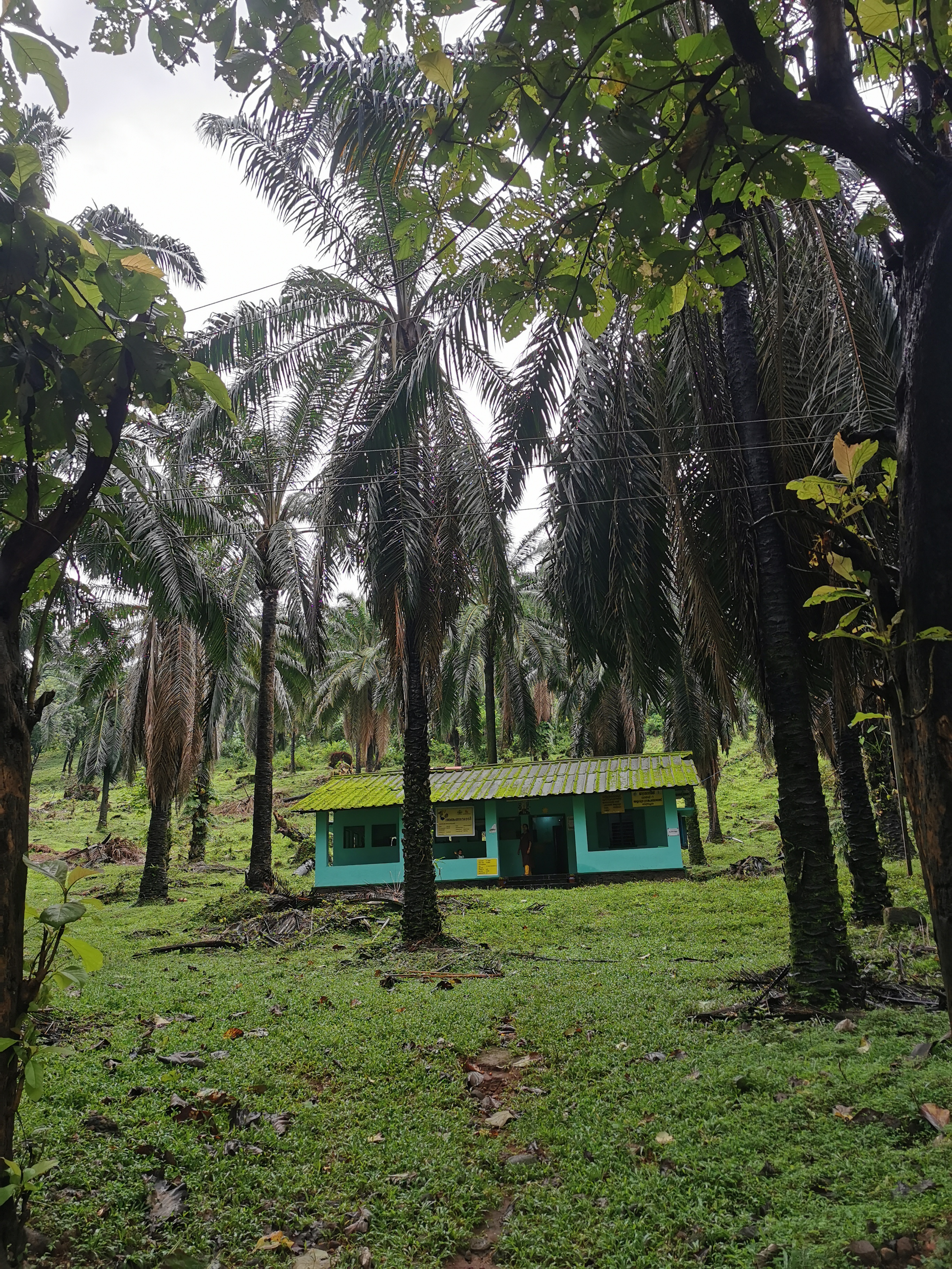 The landscape now transitioned from rubber to palm trees, with a charming little Anganavadi nestled amidst them.
