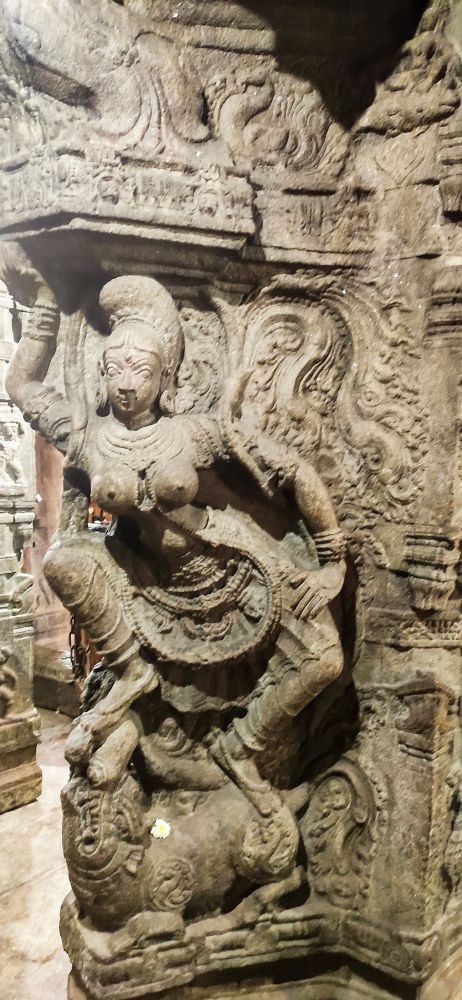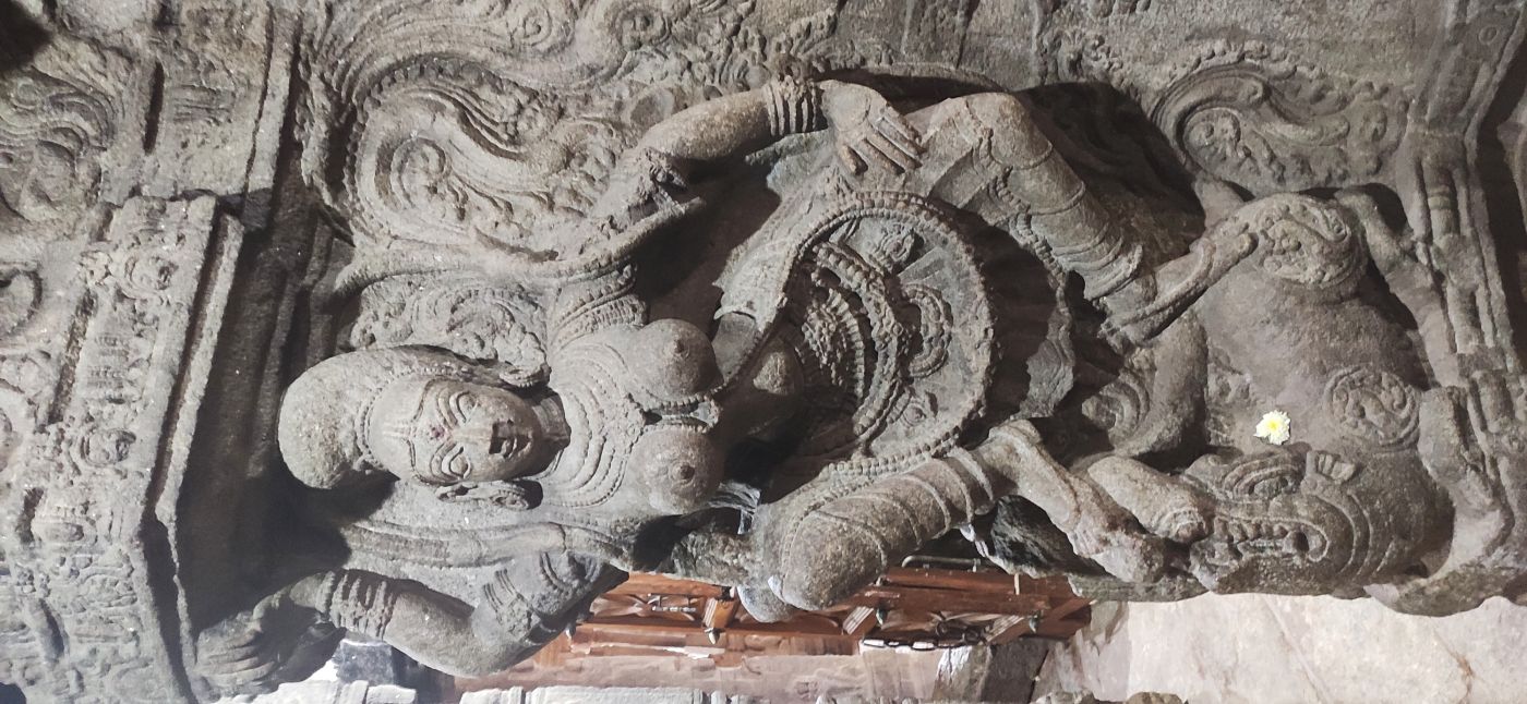 The Veerabhadra temple of Lepakshi, which was built by the brothers Viranna and Virupanna, is dedicated to Veerabhadra. It is an example of the Vijayanagara architectural style.Points of interest in the temple include a rock chain, Vastu Purusha, the Padmini race lady, the hanging pillar, Durga Paadam, the eyes of Virupaksha and Lepakshi saree designs. The paintings on the roof which feature a mural of Veerabhadra are made with natural pigments. Another interesting aspect of this temple is that it is North facing.There is a 3 headed bull with single body is carved on the pillar of main entrance.
