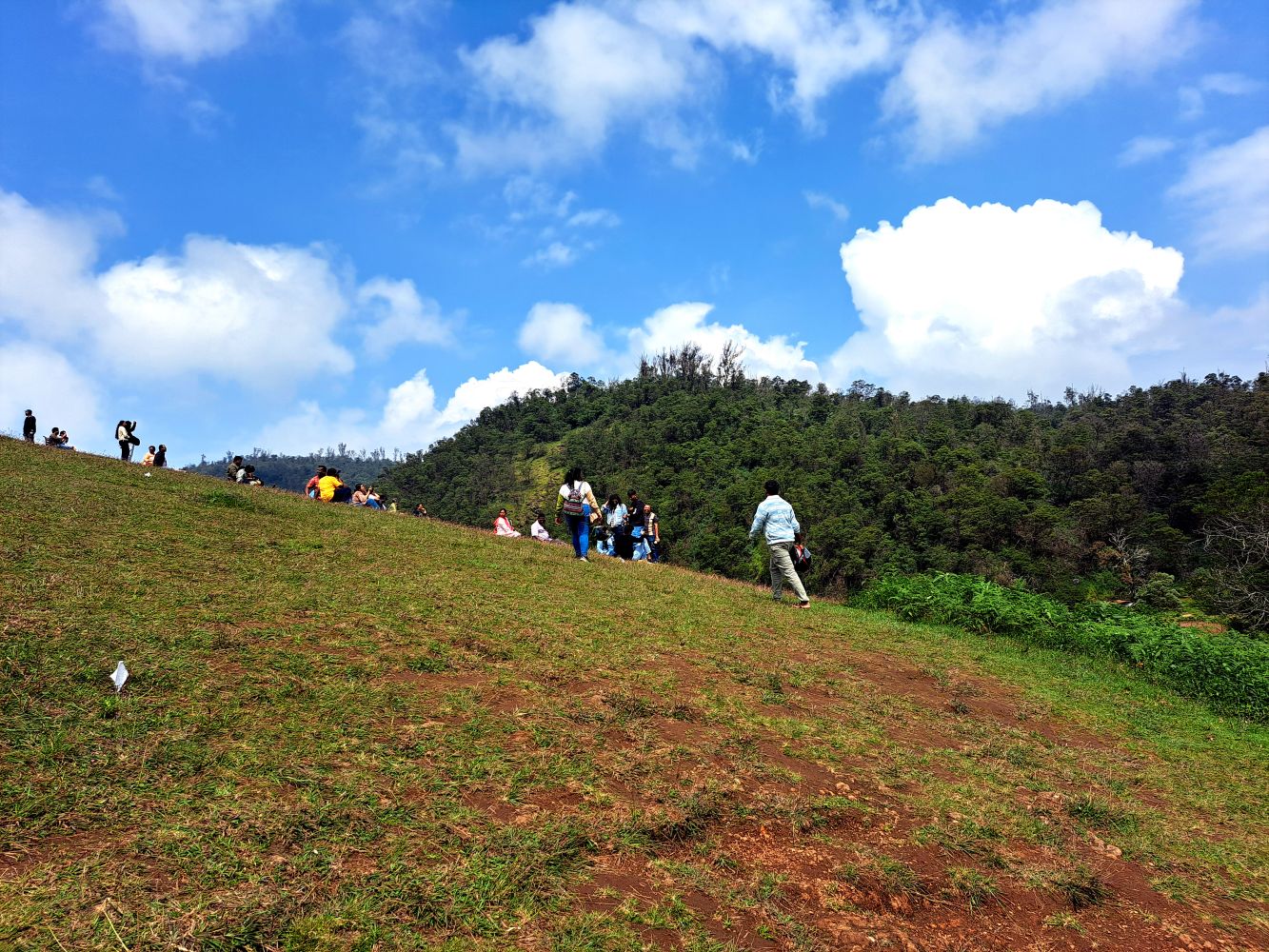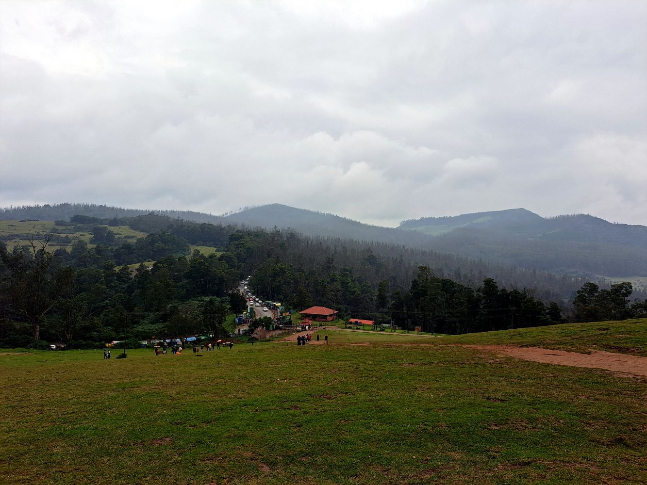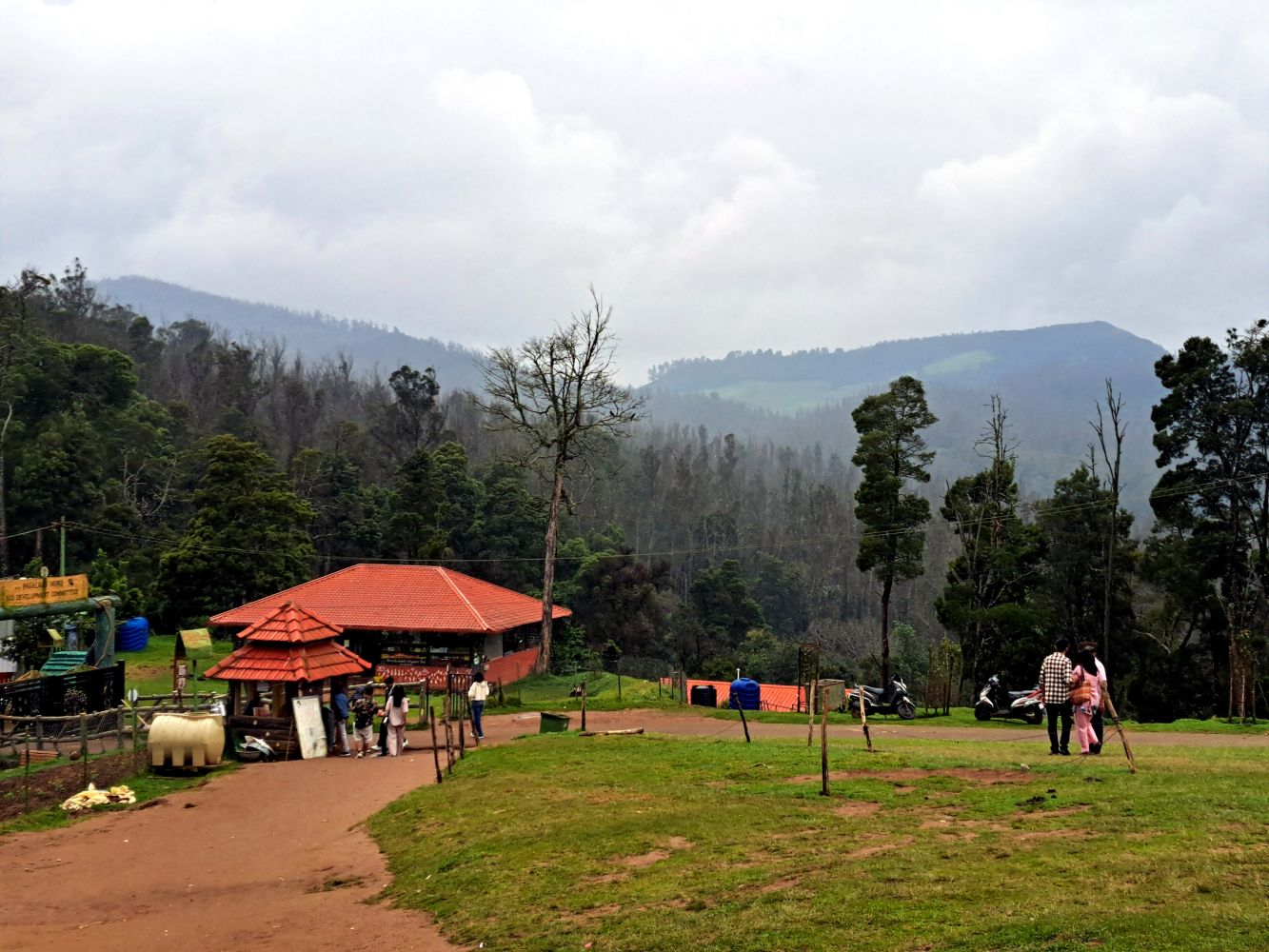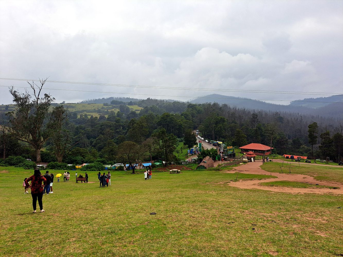 As we continued, we made a spontaneous stop at Wenlock Downs 9th Mile Shooting Point, even though a sudden drizzle had started. Despite the rain, we decided to climb up to the hilltop. The area is open from 8:00 AM to 6:00 PM, and the entry fee is ₹10 per person. The view from the top was absolutely stunning — panoramic Nilgiri Hills on one side, blanketed in pine forests, and rolling green grasslands stretching endlessly on the other. It was the perfect finale to our journey.