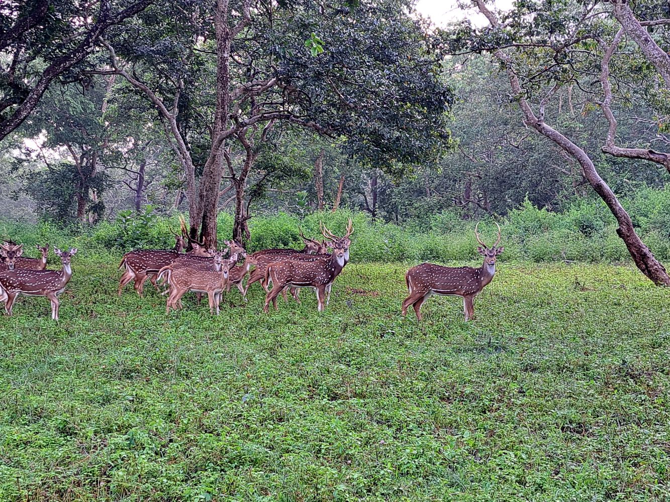 Once we entered the Mudumalai forest, we noticed a dramatic change in the vegetation and environment. Unlike Bandipur, which had more shrubs and grasses, Mudumalai was full of tall trees and dotted with small hills. Along the way, we saw herds of deer at several spots. Just after crossing the Mudumalai forest border, we reached Molapalli village — our final destination for the day and the location of our stay, Deep Jungle Home Resort.