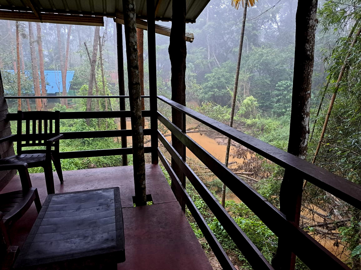 The second morning began with a mesmerizing view of a fog-filled jungle and a stream flowing just beyond our backside balcony. Our tree house had two rooms with a shared front balcony and separate private balconies at the back. I called my parents, who were staying in the adjacent room, and asked them to come out and enjoy the stunning jungle view. They stepped out, and we spent some time chatting about the resort and our overall jungle experience.