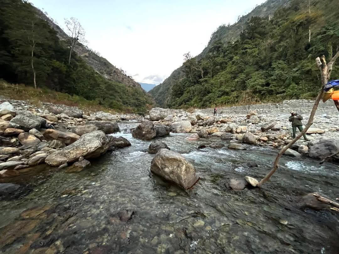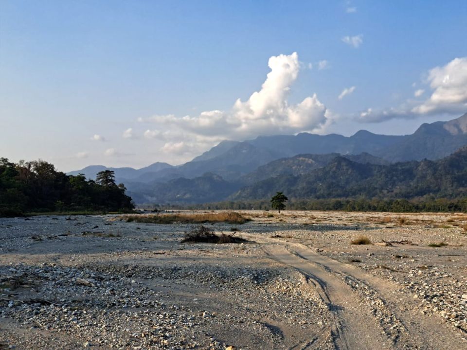 The first thing I noticed after stepping onto the Jayanti riverbed was the green Himalayan mountain range rising behind the dazzling white stretch of the riverbed. Interestingly, even on Google Maps, the riverbed appears white. This striking color comes from the pebbles, stones, and sand composed of materials like quartz and limestone. These pebbles and rocks have been eroded from the surrounding Himalayan hills. Their bright appearance is due to the reflection of sunlight on the stones, which are naturally polished by the continuous flow of the river.