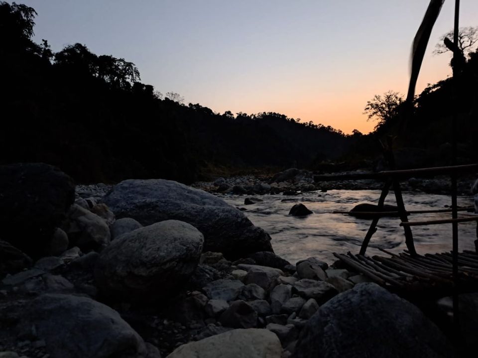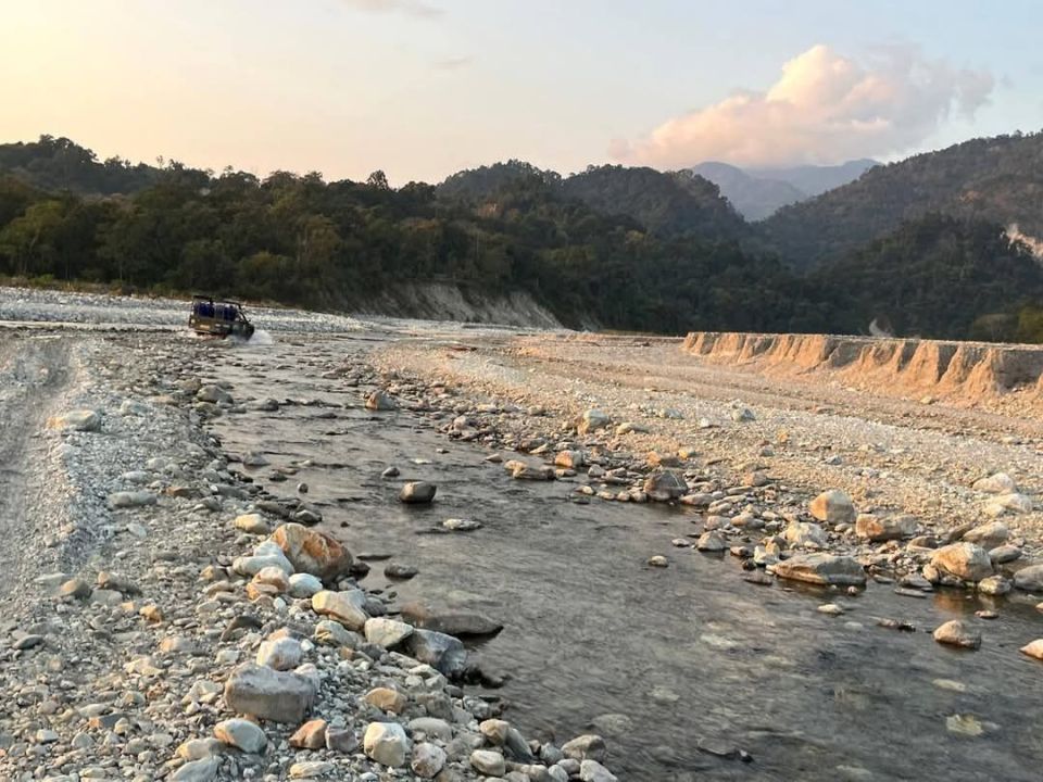 After the 2-hour jungle safari, we returned to the same spot where we had started. As the sun was about to set, we embarked on the most adventurous part of our trip—the Mahakal Safari. It was truly a once-in-a-lifetime experience, crossing the Jayanti River over bumpy rocks and pebbles to reach the foothills.